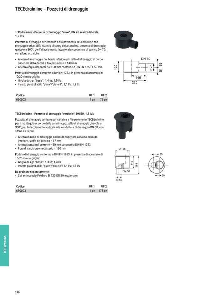 • Altezza acqua nel pozzetto = 50 mm secondo la DIN EN 1253
