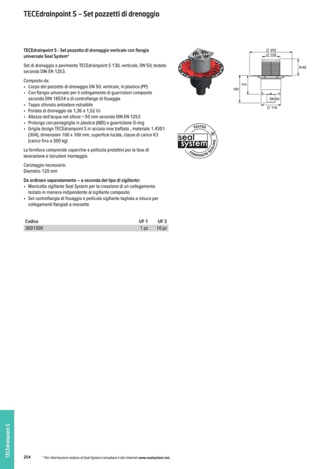 Set di drenaggio a pavimento TECEdrainpoint S 130, verticale, DN 50, testato