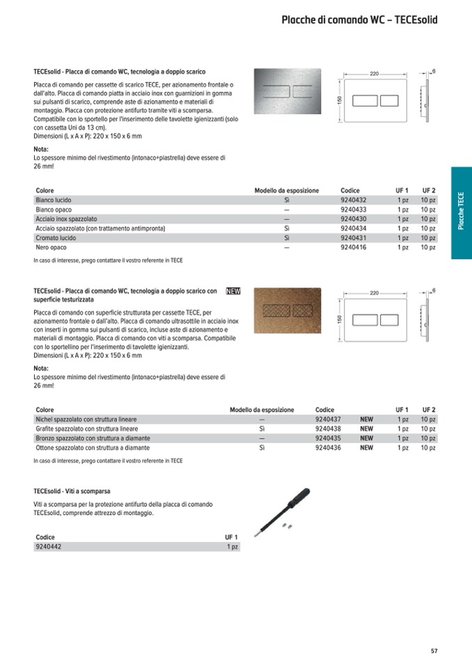 materiali di montaggio. Placca di comando con viti a scomparsa. Compatibile
