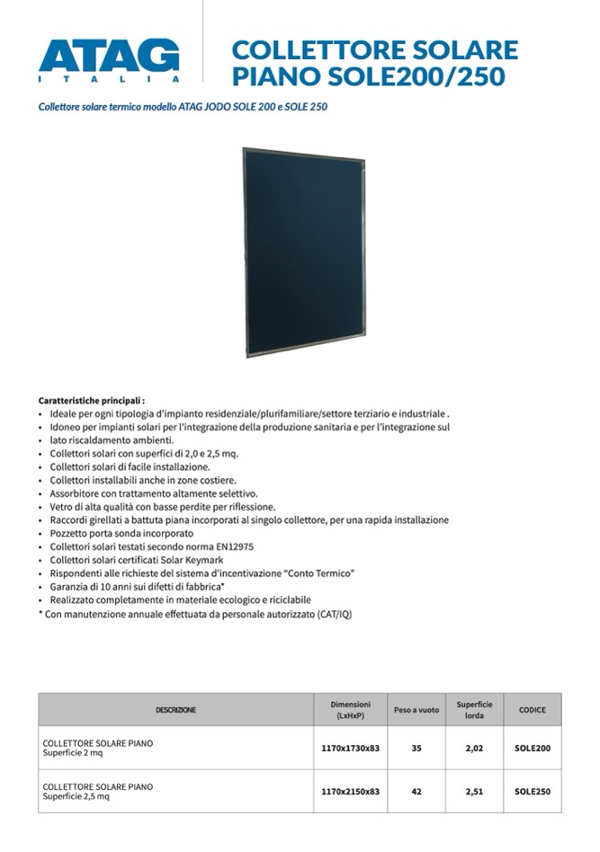 Collettore solare termico modello ATAG JODO SOLE 200 e SOLE 250