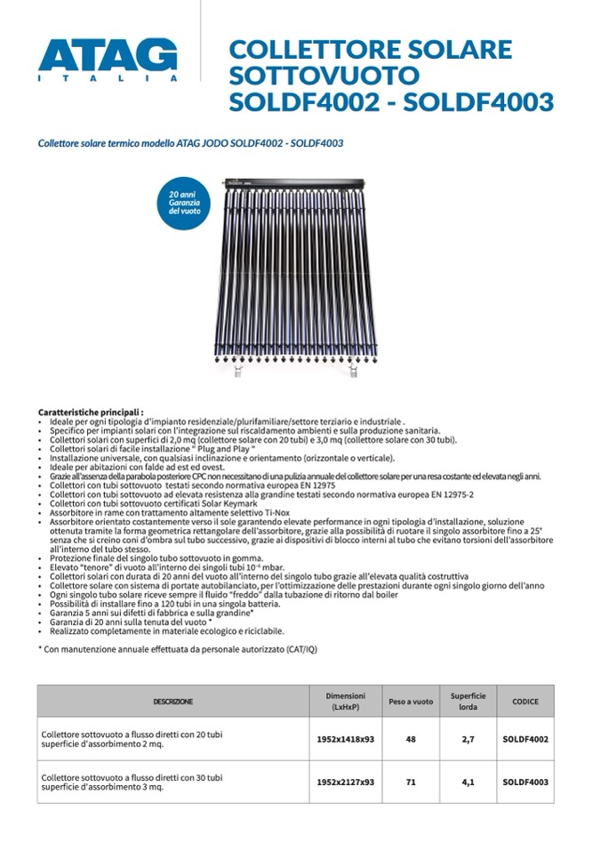 • Collettori solari con durata di 20 anni del vuoto all’interno del singolo tubo grazie all’elevata qualità costruttiva