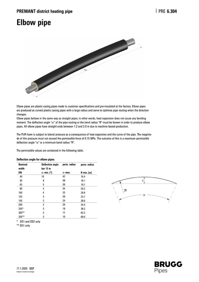 moment. The deflection angle "a" of the pipe routing or the bend radius "R" must be known in order to produce elbow