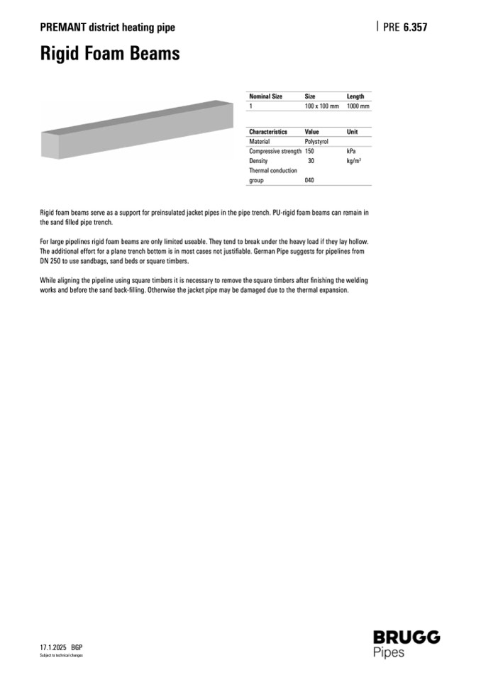 Rigid foam beams serve as a support for preinsulated jacket pipes in the pipe trench. PU-rigid foam beams can remain in