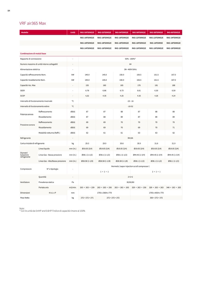 * Con le unità da 0.4HP and 0.6HP l’indice di capacità rimane al 150%