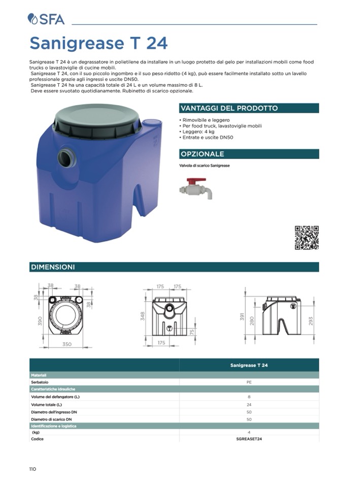 Sanigrease T 24 è un degrassatore in polietilene da installare in un luogo protetto dal gelo per installazioni mobili come food