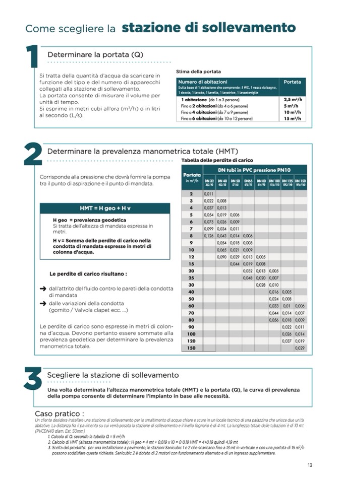 3. Scelta del prodotto: per una installazione a pavimento, le stazioni Sanicubic 1 e 2 che scaricano fino a 13 mt in verticale e con una portata di 15 m