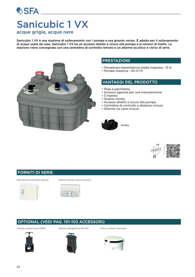 Sanicubic 1 VX è una stazione di sollevamento con 1 pompa e una girante vortex. È adatto per il sollevamento