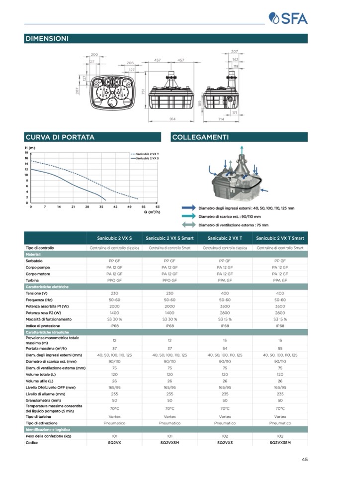 Diametro degli ingressi esterni : 40, 50, 100, 110, 125 mm