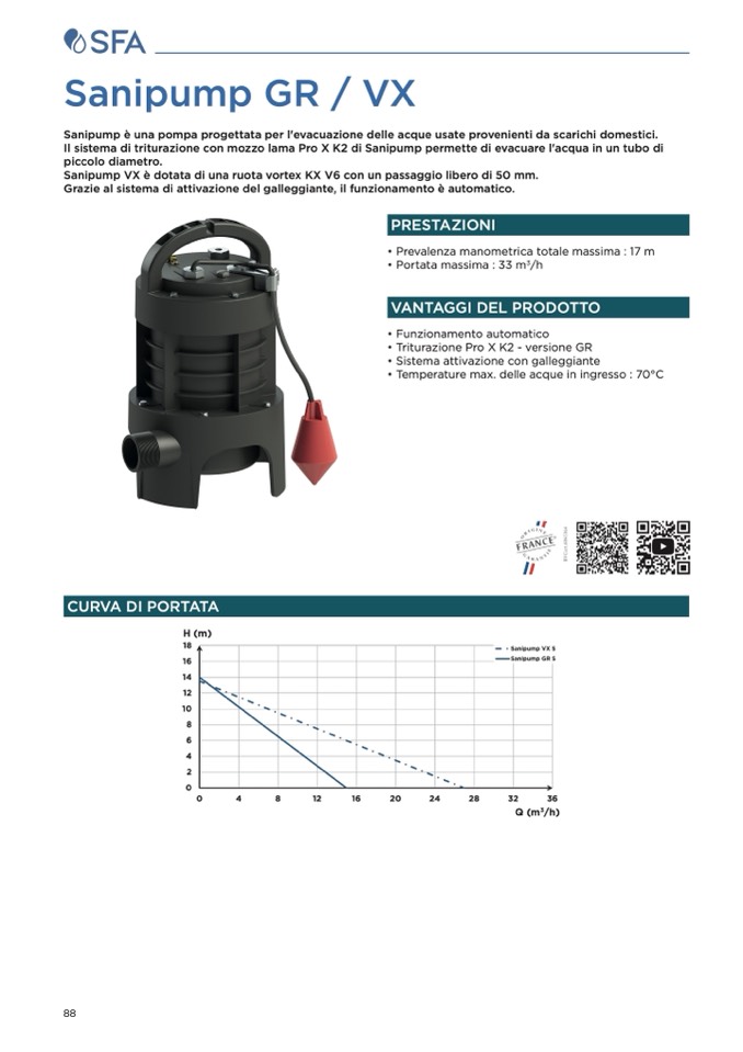 Sanipump VX è dotata di una ruota vortex KX V6 con un passaggio libero di 50 mm.