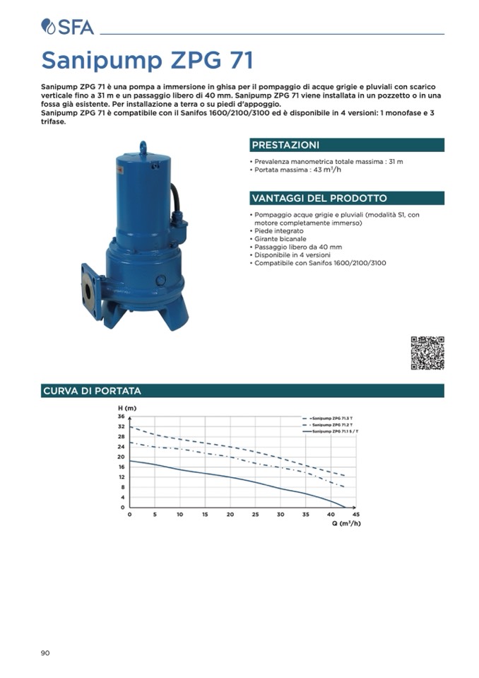 Sanipump ZPG 71 è compatibile con il Sanifos 1600/2100/3100 ed è disponibile in 4 versioni: 1 monofase e 3