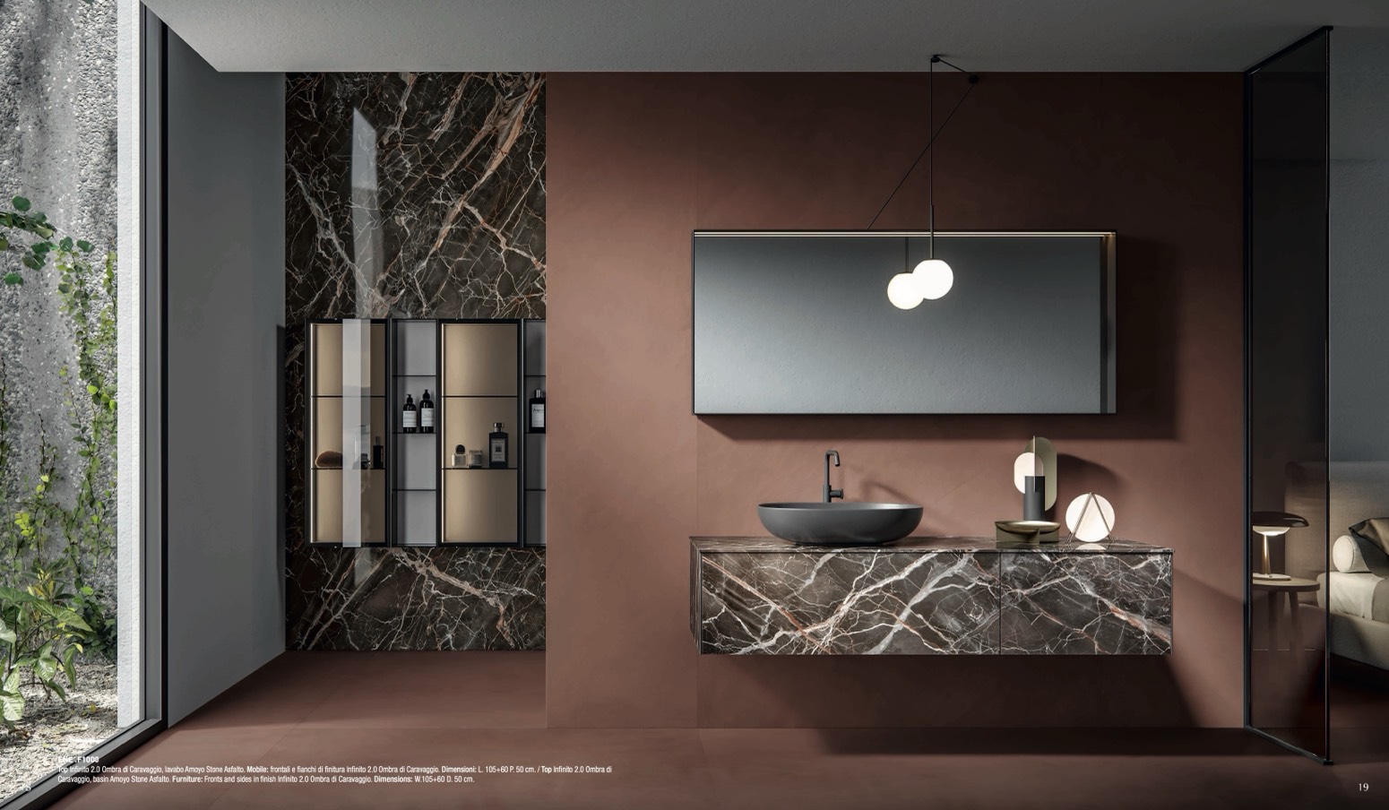 Caravaggio, basin Amoyo Stone Asfalto. Furniture: Fronts and sides in finish Infinito 2.0 Ombra di Caravaggio. Dimensions: W.105+60 D. 50 cm.