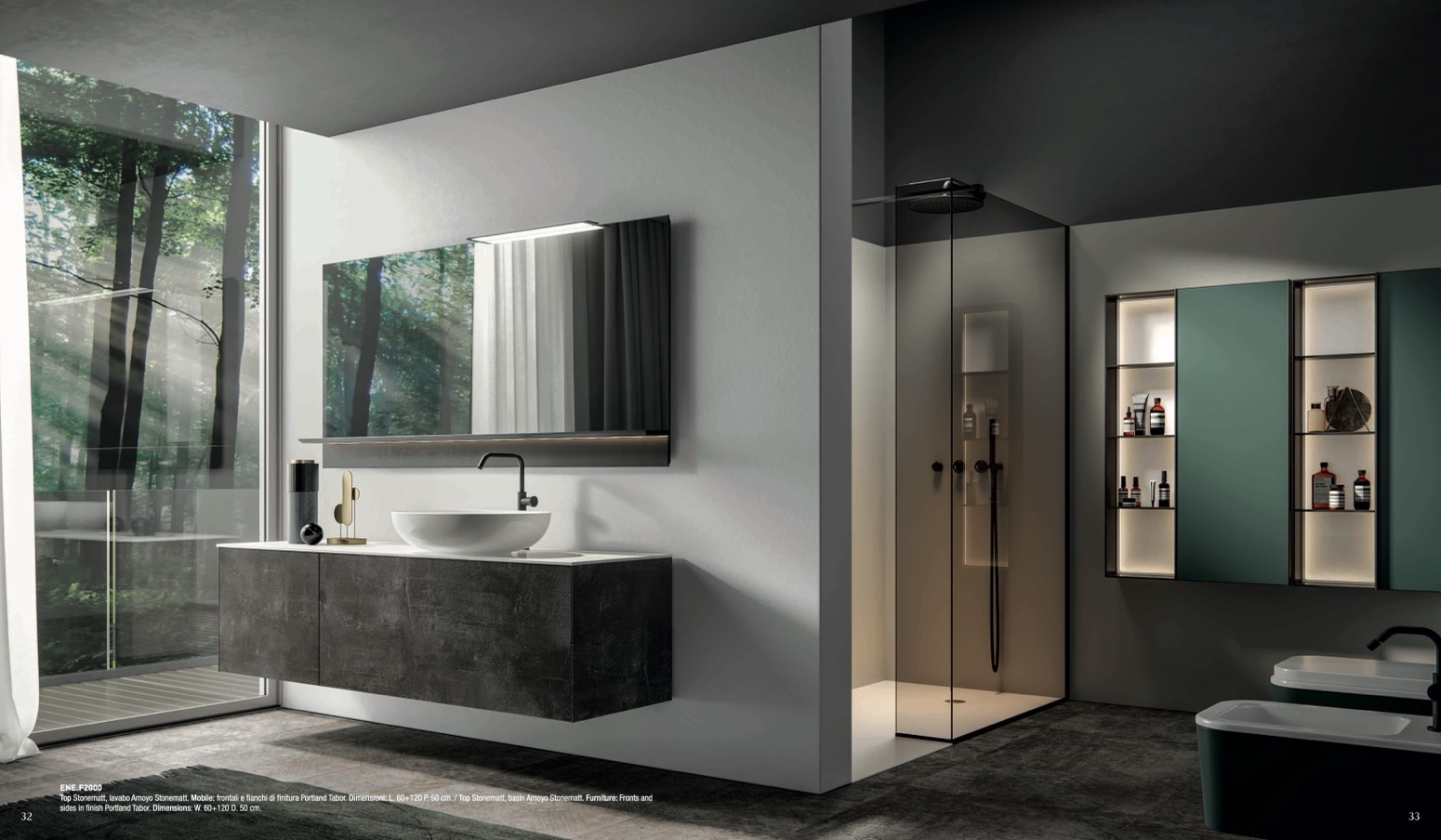 Top Stonematt, lavabo Amoyo Stonematt. Mobile: frontali e fianchi di finitura Portland Tabor. Dimensioni: L. 60+120 P. 50 cm. / Top Stonematt, basin Amoyo Stonematt. Furniture: Fronts and