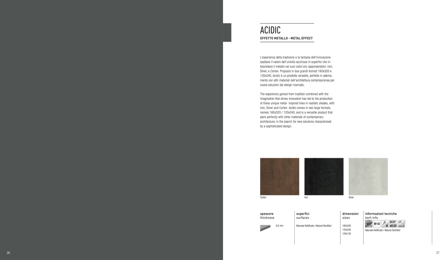 Iron, Silver and Corten. Acidic comes in two large formats,
