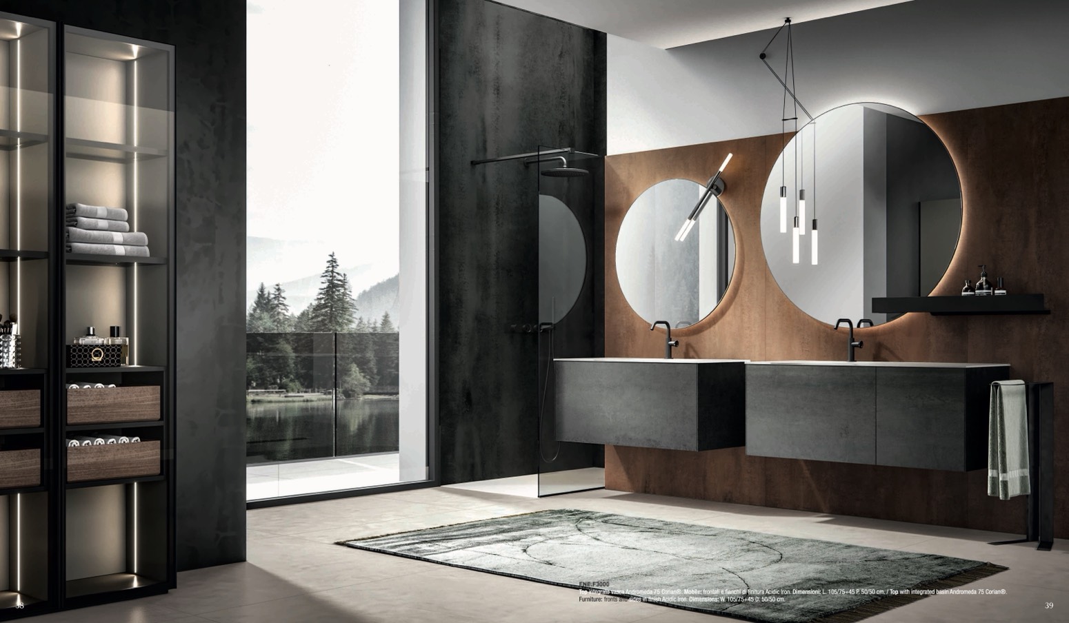 Furniture: fronts and sides in finish Acidic Iron. Dimensions: W. 105/75+45 D. 50/50 cm.
