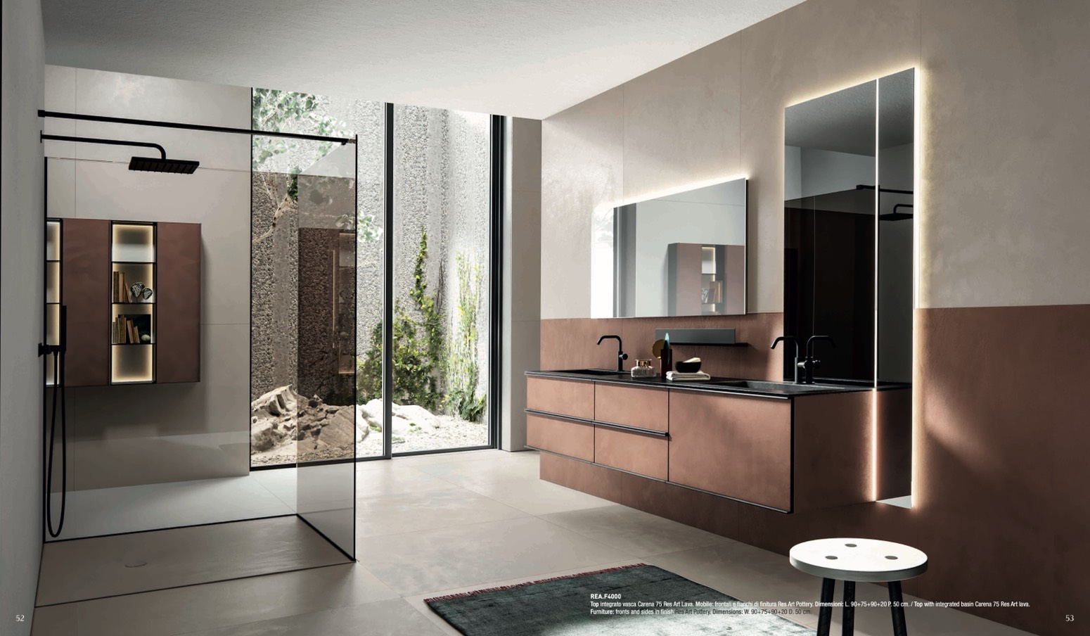 Top integrato vasca Carena 75 Res Art Lava. Mobile: frontali e fianchi di finitura Res Art Pottery. Dimensioni: L. 90+75+90+20 P. 50 cm. / Top with integrated basin Carena 75 Res Art lava.