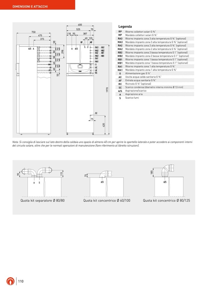 Nota: Si consiglia di lasciare sul lato destro della caldaia uno spazio di almeno 40 cm per aprire lo sportello laterale e poter accedere ai componenti interni