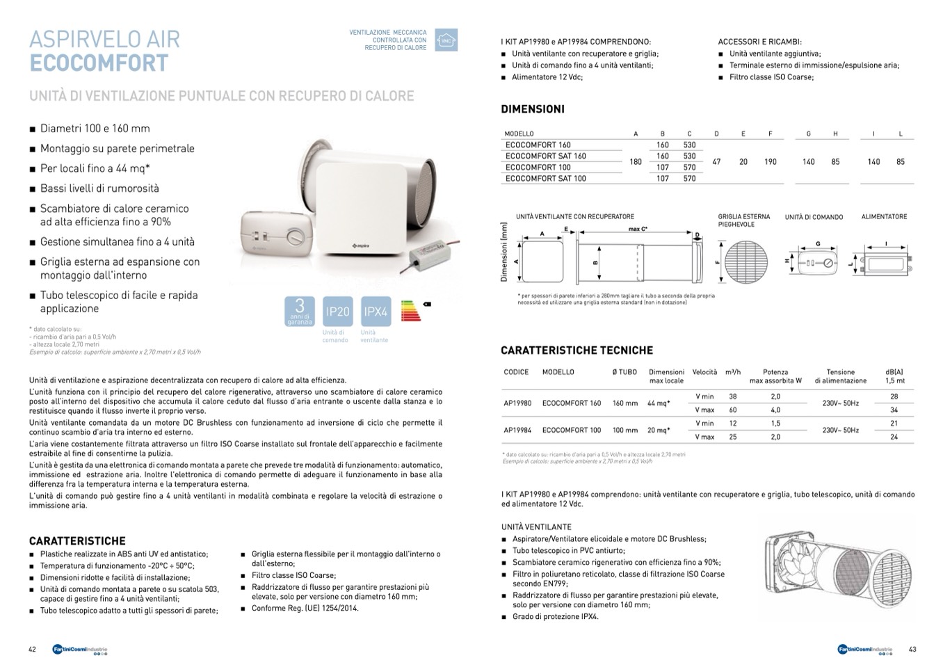 I KIT AP19980 e AP19984 comprendono: unità ventilante con recuperatore e griglia, tubo telescopico, unità di comando