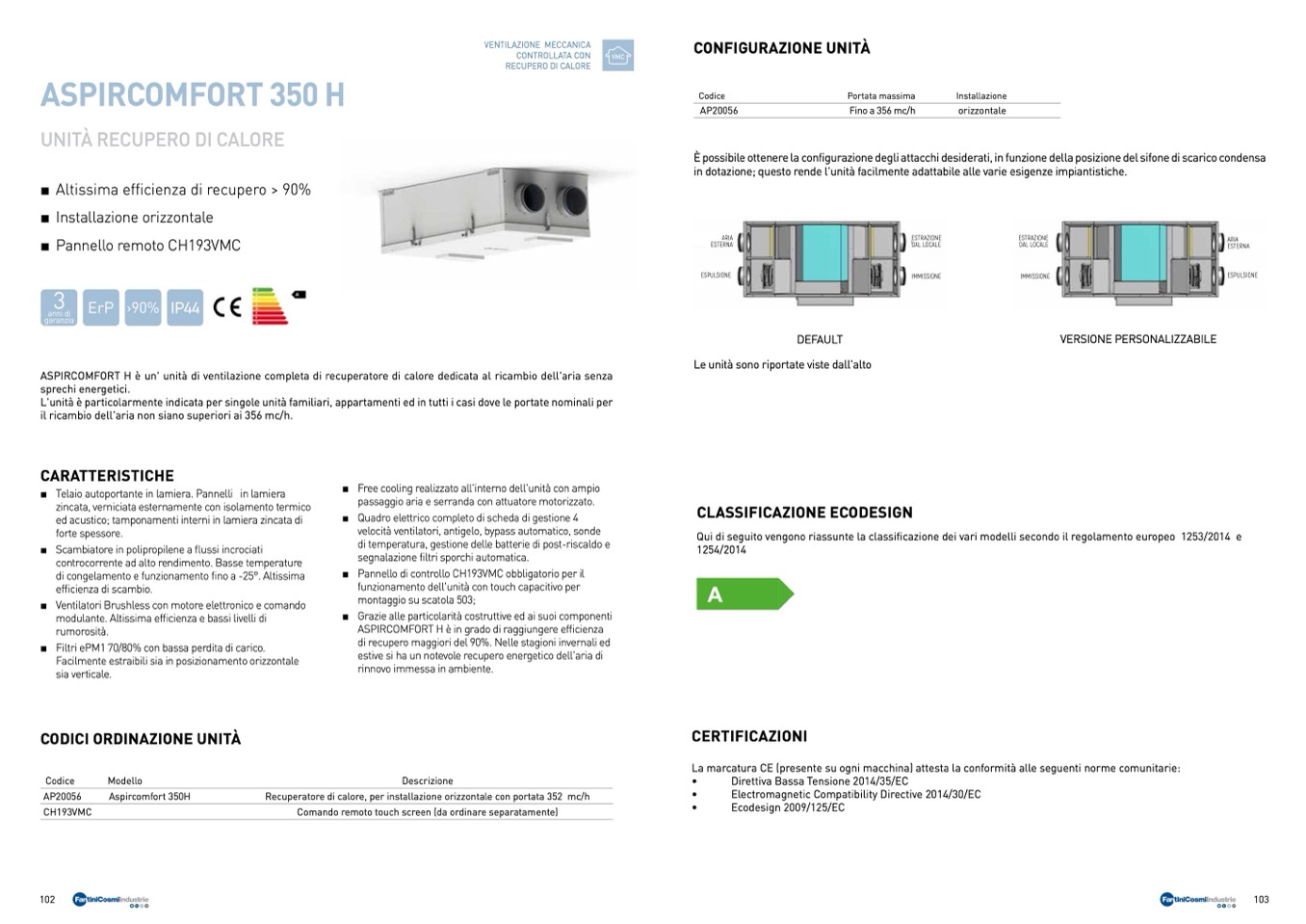 ASPIRCOMFORT H è un' unità di ventilazione completa di recuperatore di calore dedicata al ricambio dell'aria senza