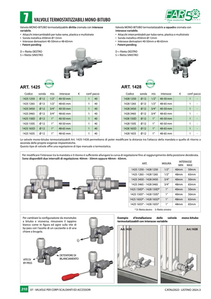 Le valvole mono-bitubo termostatizzabili Art. 1425-1428 permettono di poter modificare la distanza tra l’attacco della mandata e quello di ritorno a