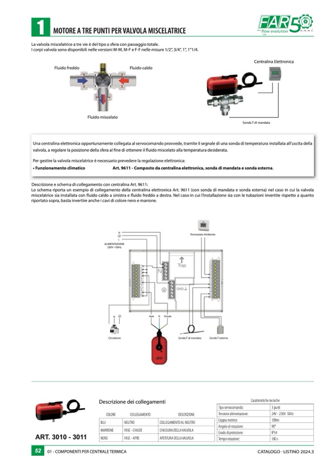 Lo schema riporta un esempio di collegamento della centralina elettronica Art. 9611 (con sonda di mandata e sonda esterna) nel caso in cui la valvola