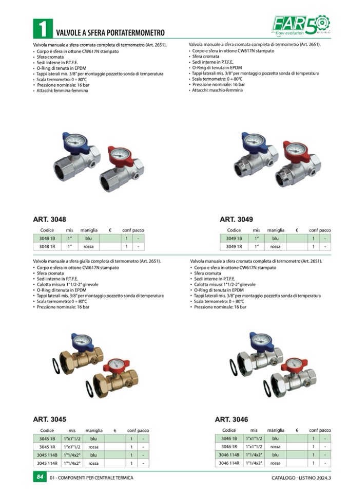 Valvola manuale a sfera cromata completa di termometro (Art. 2651).