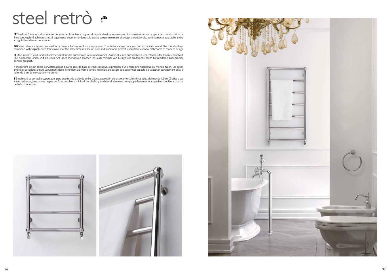 E Steel retrò es un toallero, pensado para cuartos de baño de estilo clásico, expresión de una memoria histórica típica del mundo itálico. Gracias a sus