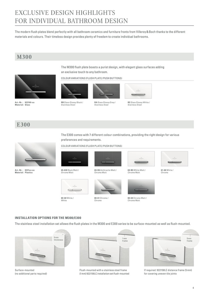 The modern flush plates blend perfectly with all bathroom ceramics and furniture fronts from Villeroy&Boch thanks to the different
