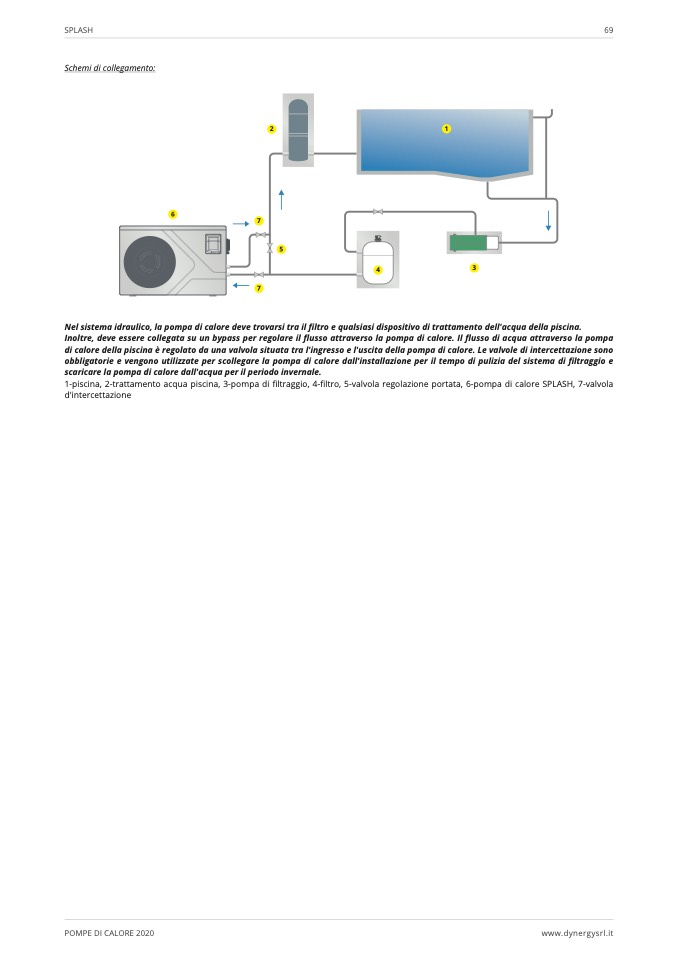 1-piscina, 2-trattamento acqua piscina, 3-pompa di filtraggio, 4-filtro, 5-valvola regolazione portata, 6-pompa di calore SPLASH, 7-valvola