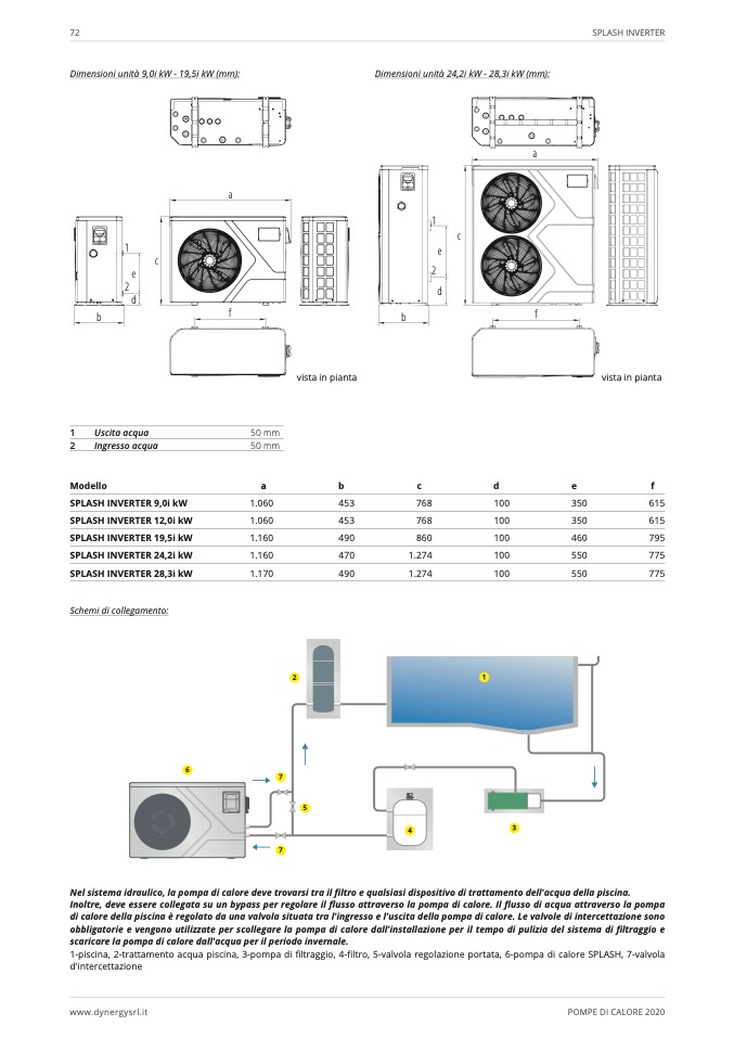 1-piscina, 2-trattamento acqua piscina, 3-pompa di filtraggio, 4-filtro, 5-valvola regolazione portata, 6-pompa di calore SPLASH, 7-valvola