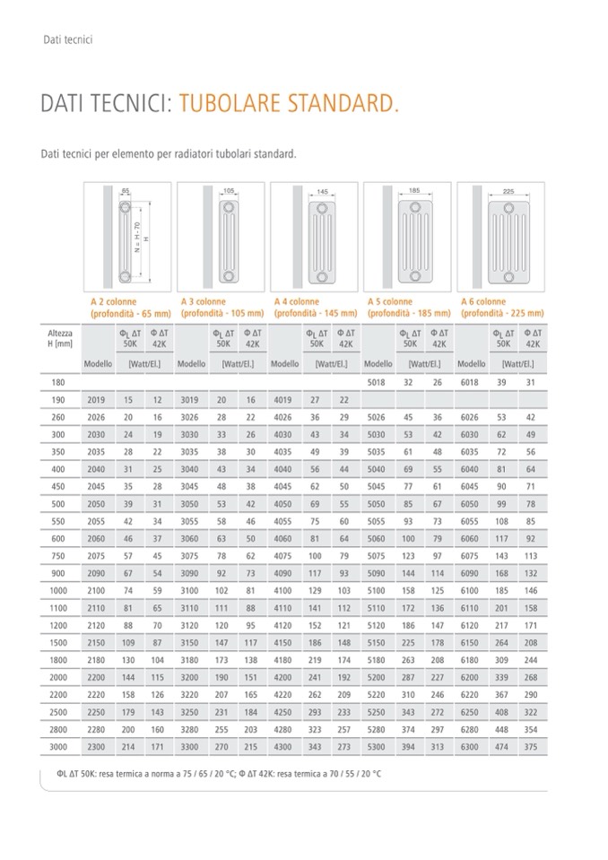 ΦL ΔT 50K: resa termica a norma a 75 / 65 / 20 °C; Φ ΔT 42K: resa termica a 70 / 55 / 20 °C