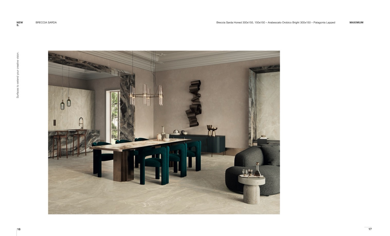 Breccia Sarda Honed 300x150, 150x150 – Arabescato Orobico Bright 300x150 – Patagonia Lapped