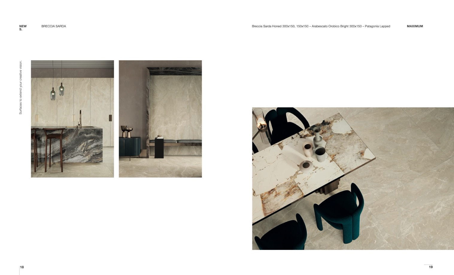 Breccia Sarda Honed 300x150, 150x150 – Arabescato Orobico Bright 300x150 – Patagonia Lapped