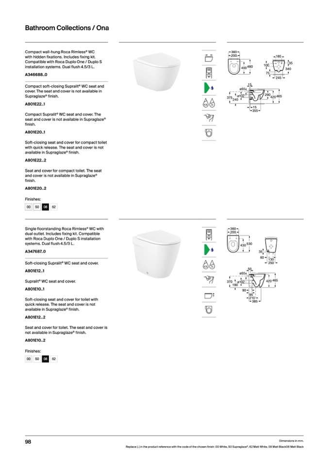 Replace (..) in the product reference with the code of the chosen finish: 00 White, S0 Supraglaze®, 62 Matt White, 08 Matt Black08 Matt Black