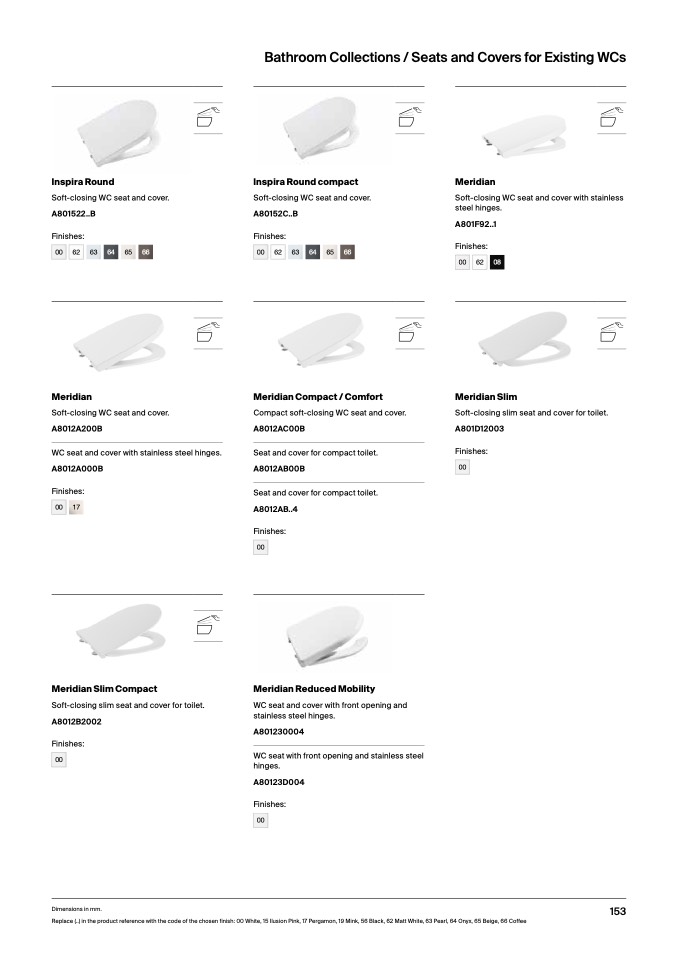 Replace (..) in the product reference with the code of the chosen finish: 00 White, 15 Ilusion Pink, 17 Pergamon, 19 Mink, 56 Black, 62 Matt White, 63 Pearl, 64 Onyx, 65 Beige, 66 Coffe