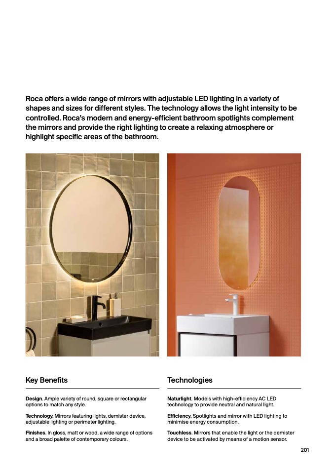 controlled. Roca’s modern and energy-efficient bathroom spotlights complement