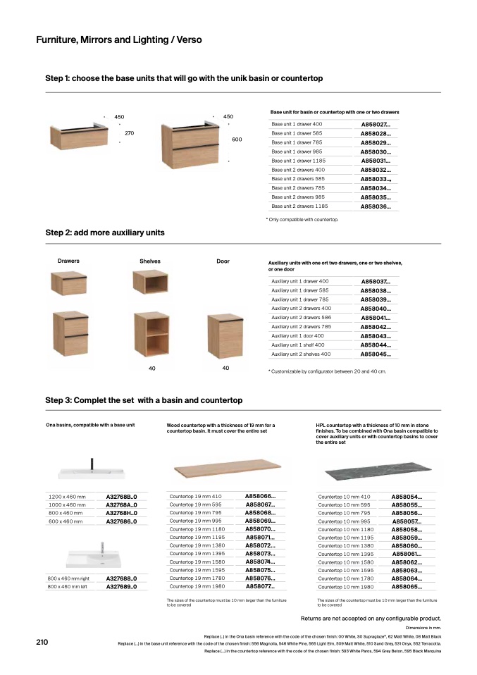 Replace (...) in the base unit reference with the code of the chosen finish: 556 Magnolia, 546 White Pine, 565 Light Elm, 509 Matt White, 510 Sand Grey, 531 Onyx, 552 Terracotta