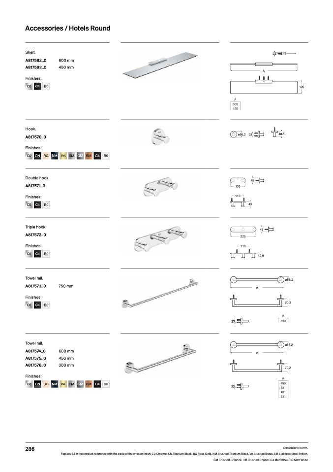 Replace (..) in the product reference with the code of the chosen finish: C0 Chrome, CN Titanium Black, RG Rose Gold, NM Brushed Titanium Black, VA Brushed Brass, SM Stainless Steel finition