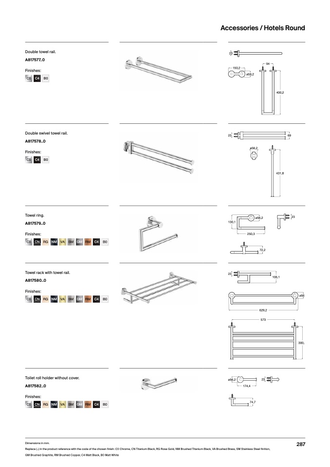 Replace (..) in the product reference with the code of the chosen finish: C0 Chrome, CN Titanium Black, RG Rose Gold, NM Brushed Titanium Black, VA Brushed Brass, SM Stainless Steel finition