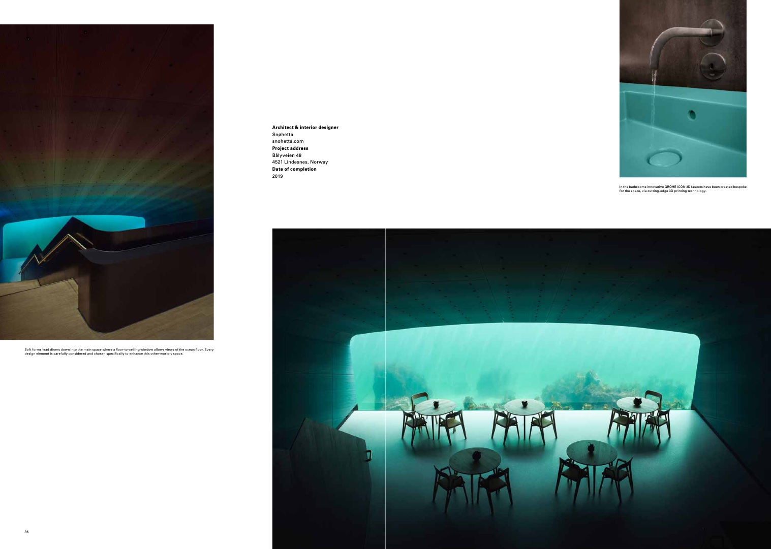 Soft forms lead diners down into the main space where a floor-to-ceiling window allows views of the ocean floor. Ever