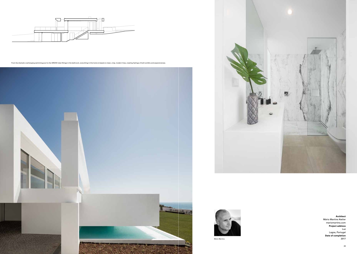 From the dramatic overhanging swimming pool to the GROHE Cube fittings in the bathroom, everything in this home is based on clean, crisp, modern lines, creating feelings of both solidity and expansiveness.