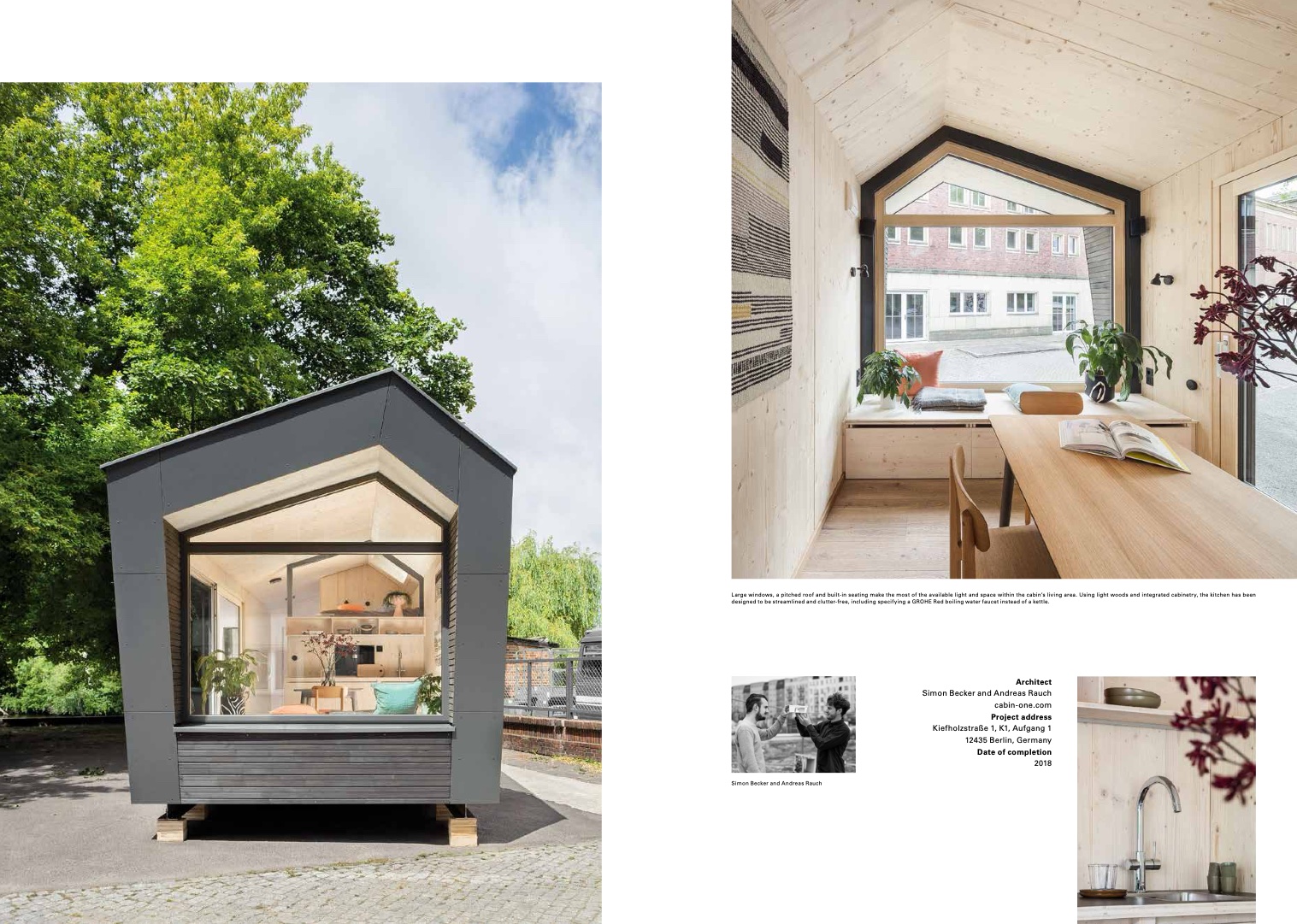 Large windows, a pitched roof and built-in seating make the most of the available light and space within the cabin’s living area. Using light woods and integrated cabinetry, the kitchen has bee