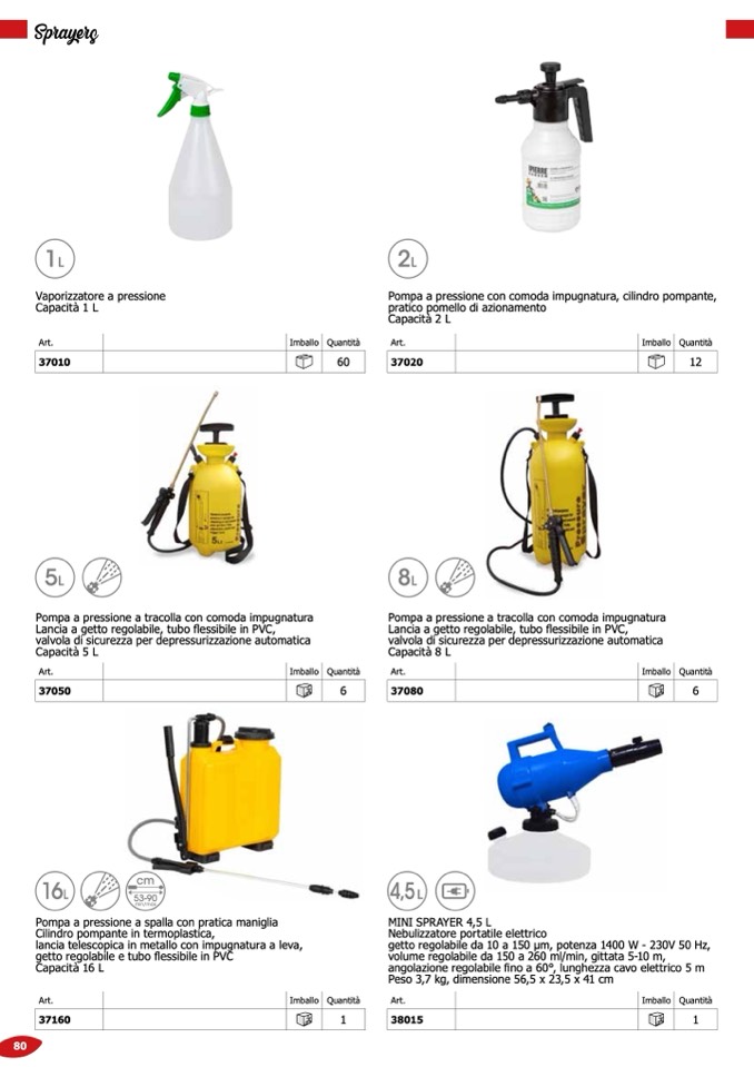 volume regolabile da 150 a 260 ml/min, gittata 5-10 m,