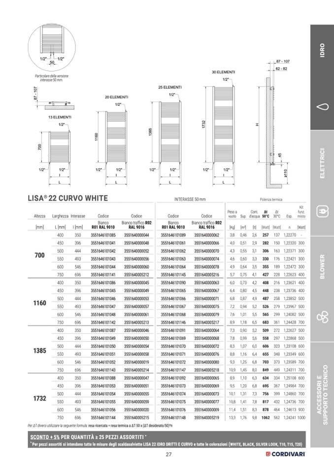 Per pezzi assortiti si intendono tutte le misure degli scaldasalviette LISA 22 IDRO DRITTI E CURVO e tutte le colorazioni (WHITE, BLACK, SILVER LOOK, T10, T15, T20)