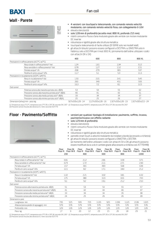 (1) Temperatura acqua 7/12°C, temperatura aria 27°C BS e 19°C BU secondo EN 1397 - (2) Temperatura acqua 40/45°C, temperatura aria 20°C BS e 15°C BU secondo EN 1397