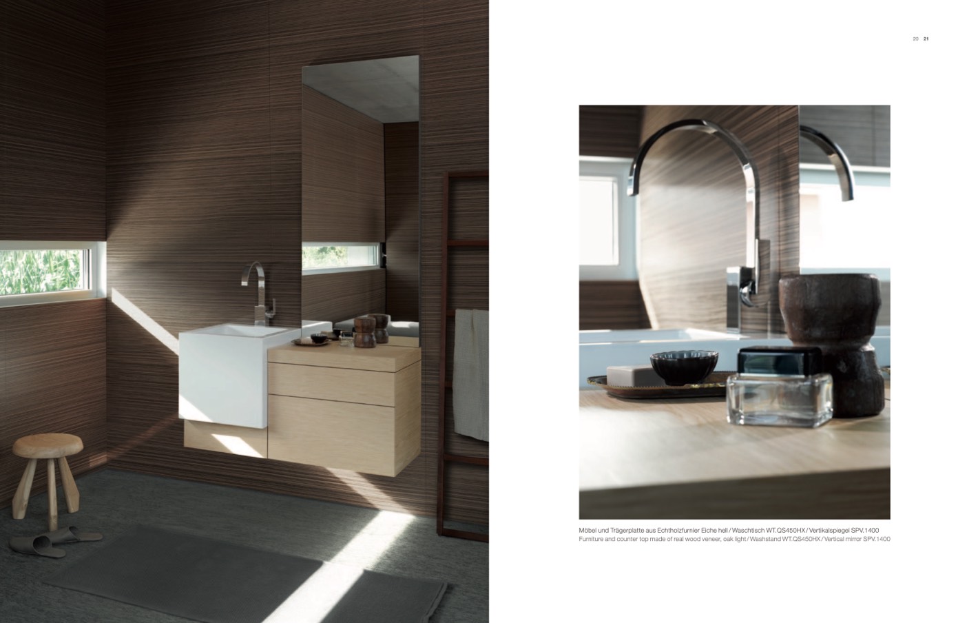 Möbel und Trägerplatte aus Echtholzfurnier Eiche hell / Waschtisch WT.QS450HX / Vertikalspiegel SPV.1400
