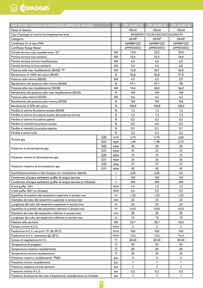 DATI TECNICI CALDAIA SOLARFRYO/SOLARFRYO DA INCASSO
