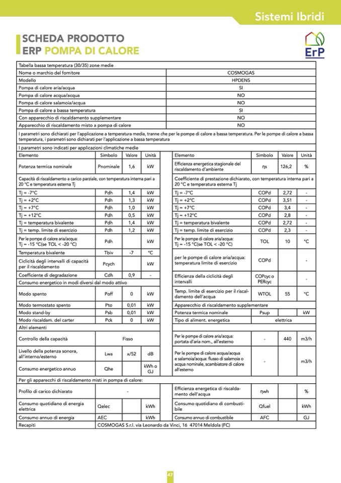 I parametri sono dichiarati per l’applicazione a temperatura media, tranne che per le pompe di calore a bassa temperatura. Per le pompe di calore a bassa