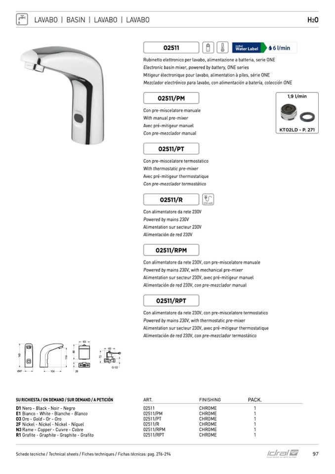 Mezclador electrónico para lavabo, con alimentación a batería, colección ONE