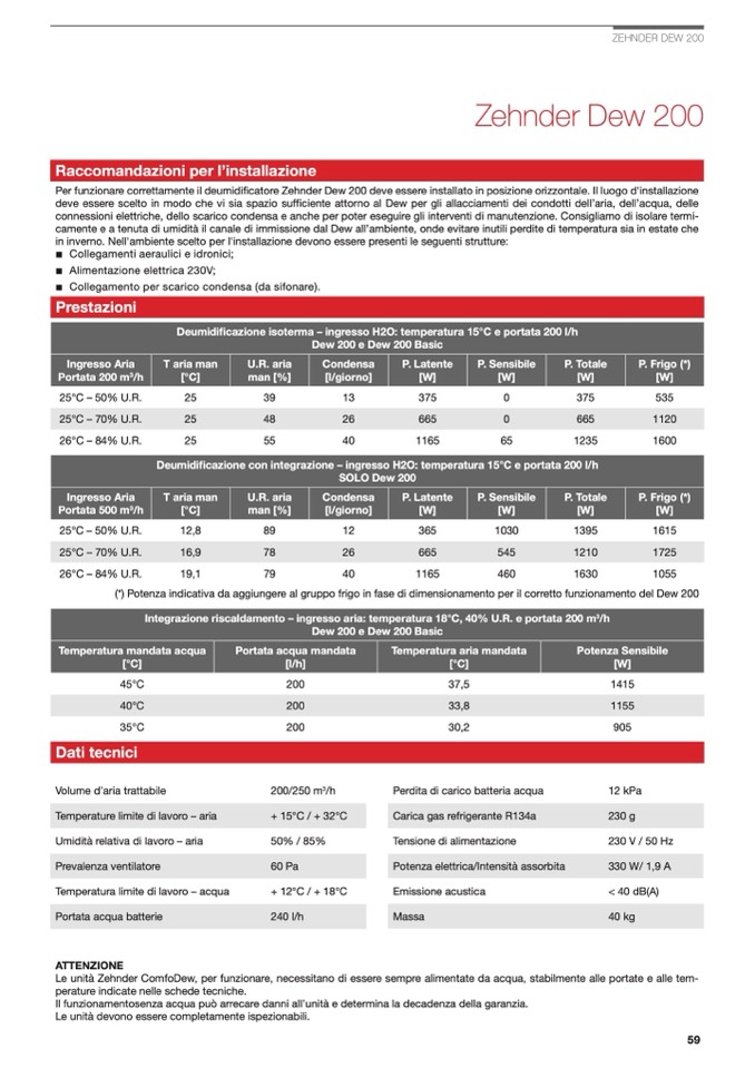 (*) Potenza indicativa da aggiungere al gruppo frigo in fase di dimensionamento per il corretto funzionamento del Dew 200