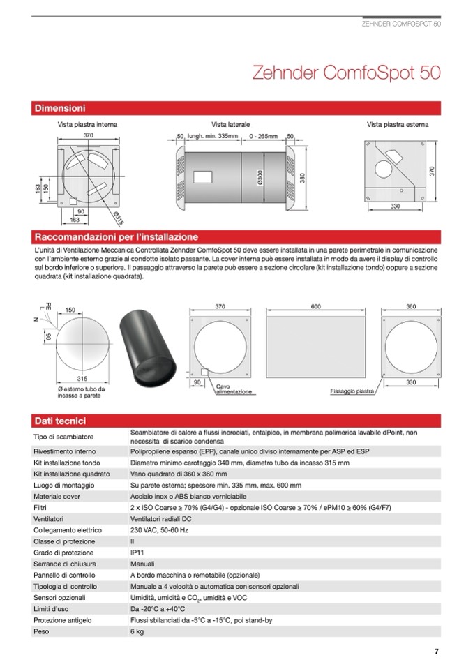L’unità di Ventilazione Meccanica Controllata Zehnder ComfoSpot 50 deve essere installata in una parete perimetrale in comunicazione